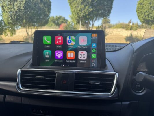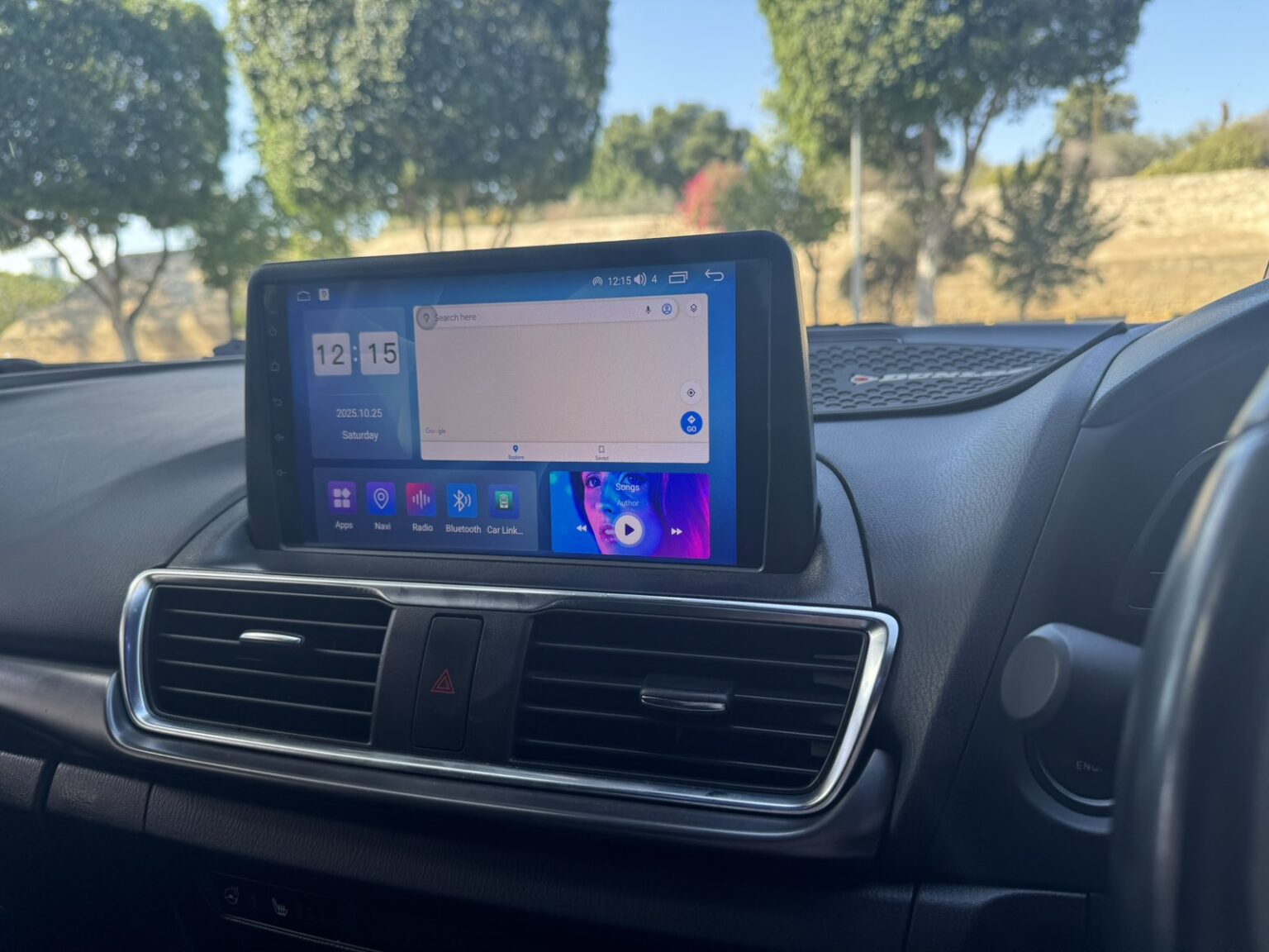 Upgrade your Mazda Axela with a 9 Inch Android One Car Stereo featuring Apple CarPlay, Android Auto, steering wheel control integration, and rear-view camera support. Professional installation at Stephanis Audio Cyprus.